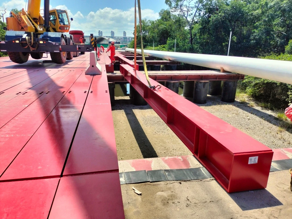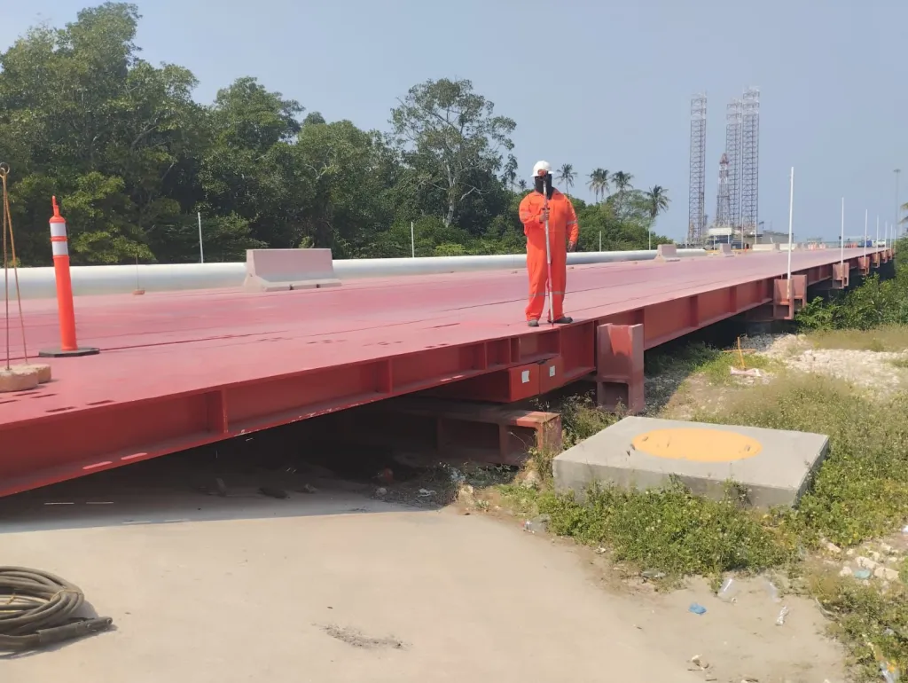 Diseño, construcción y montaje de un puente de acero estructural para soportar rutas pesadas en la Refinería Olmeca, garantizando seguridad y capacidad de carga para maquinaria y equipo industrial.